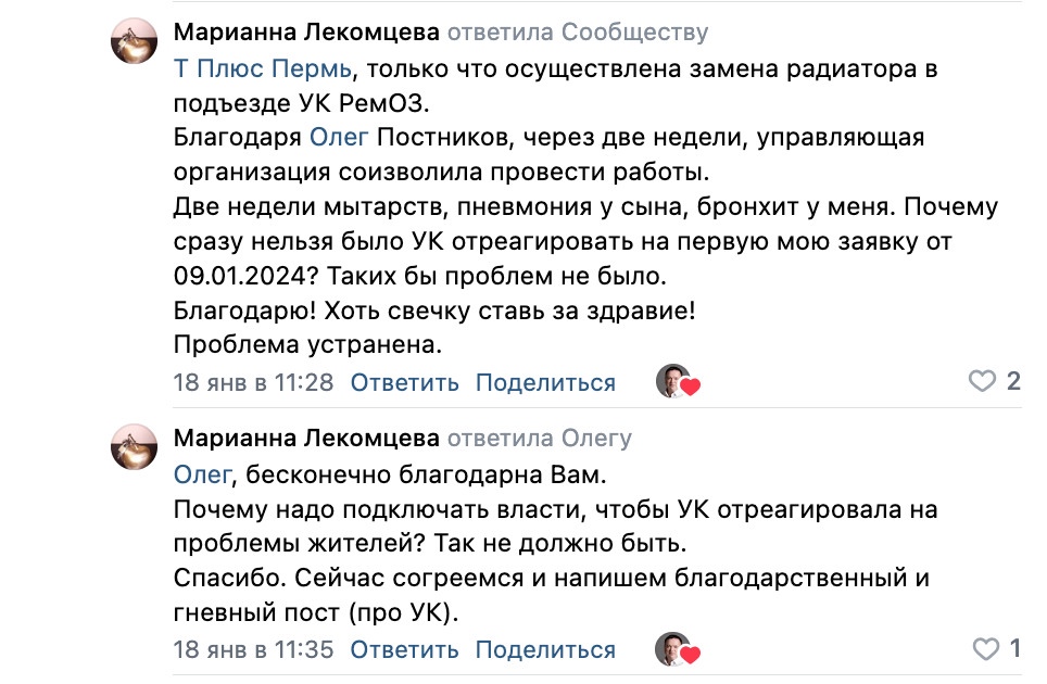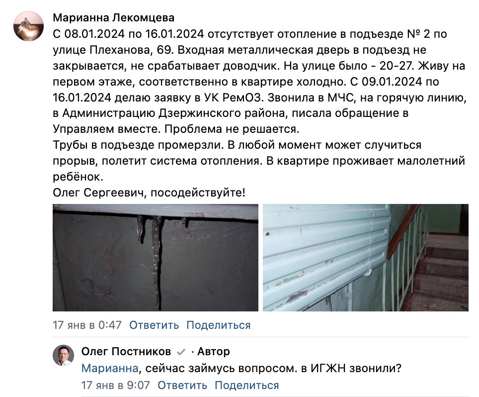 Ночью 17 января к Олегу Постникову обратилась отчаявшаяся жительница Дзержинского района города Перми. В комментариях к записи о ЖКХ она рассказала, что в морозы входная металлическая дверь в подъезд не закрывается, не срабатывает доводчик, а трубы в подъезде промерзли. Ситуация не решалась с 8 января, службы и чиновники не реагировали на просьбу о помощи.