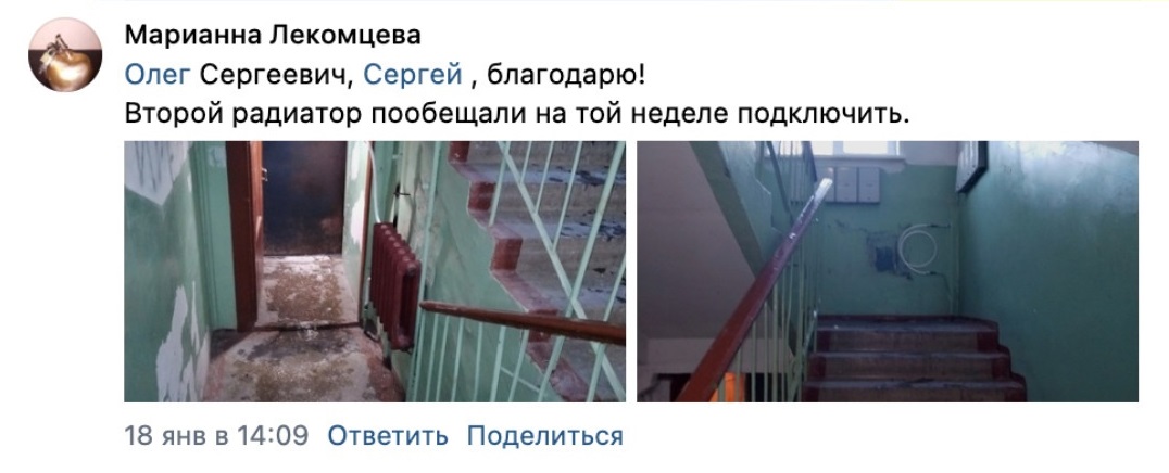 Депутат ЛДПР незамедлительно взялся за решение проблемы и уже на следующий день была произведена замена радиатора. Работники УК РемОЗ. К 19 января проблема была решена окончательно.