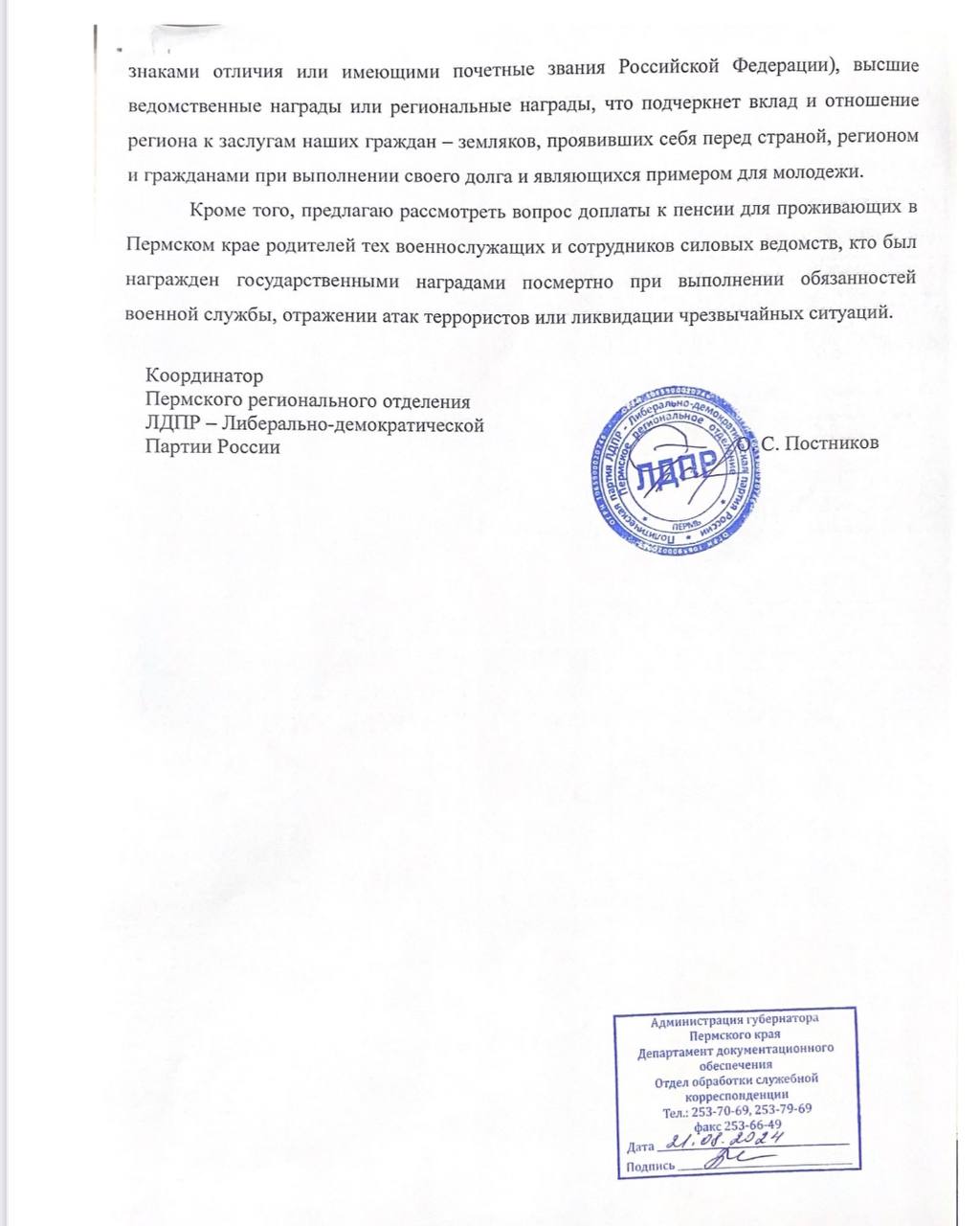 Координатор Пермского регионального отделения ЛДПР Олег Постников обратился к губернатору края Дмитрию Махонину поддержать наше предложение и инициировать вопрос об установлении региональной доплаты к пенсии военным пенсионерам и пенсионерам правоохранительных и силовых ведомств, имеющим государственные награды (высшие звания Российской Федерации, награжденные орденами и медалями, знаками отличия или имеющими почетные звания Российской Федерации), высшие ведомственные награды или региональные награды, что подчеркнет вклад и отношение региона к заслугам наших граждан – земляков, проявивших себя перед страной, регионом и гражданами при выполнении своего долга и являющихся примером для молодежи.