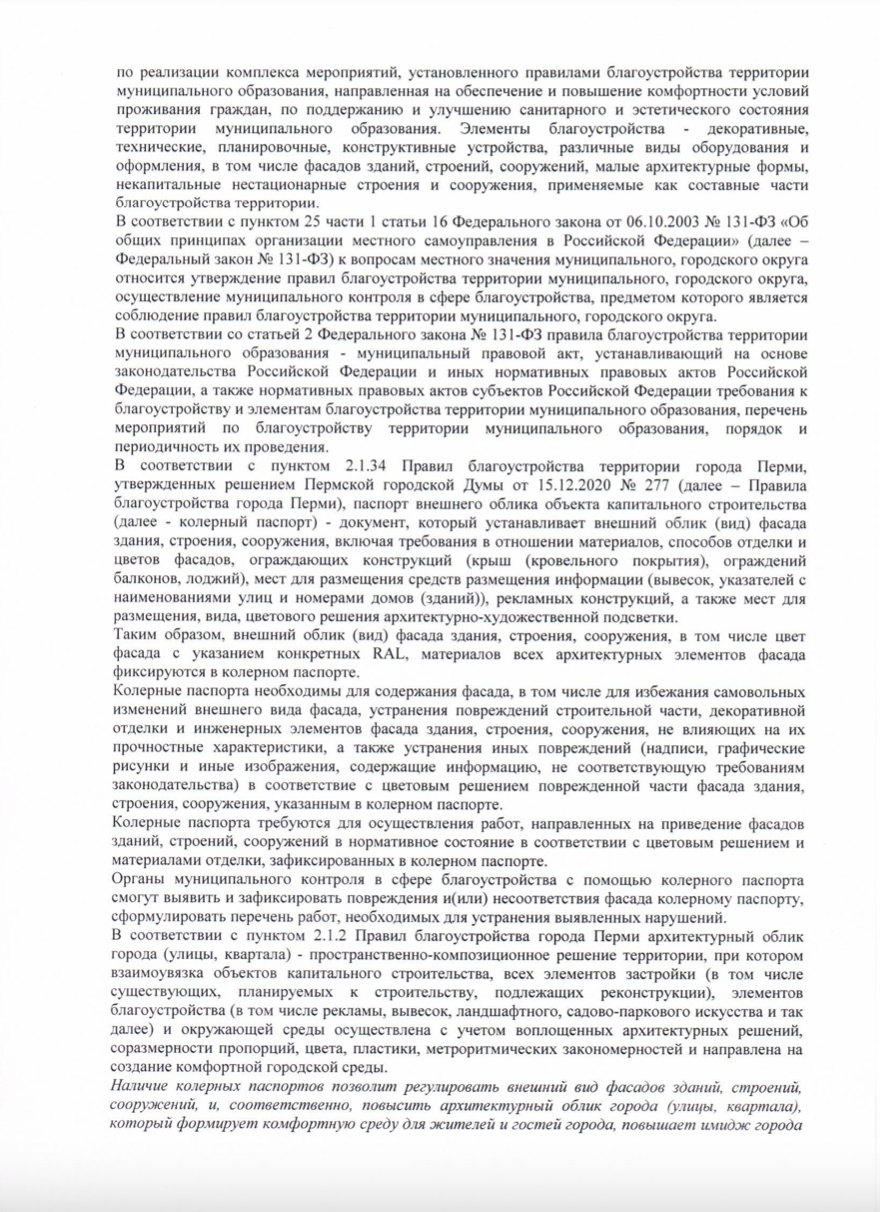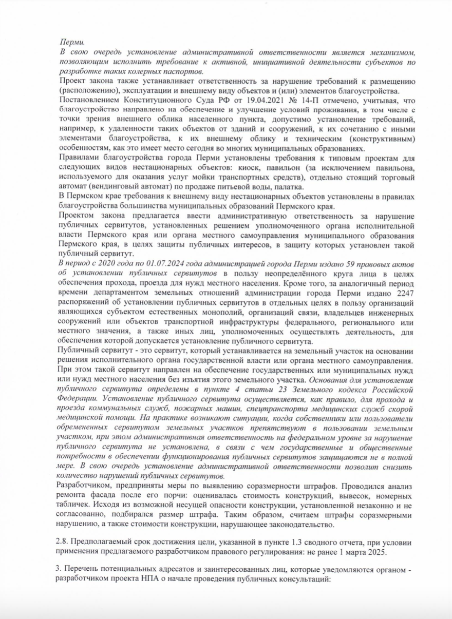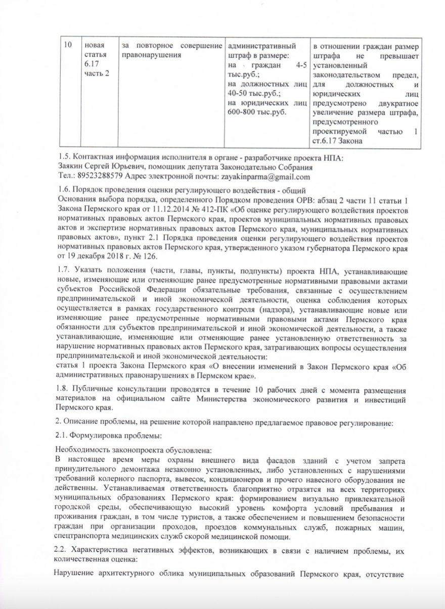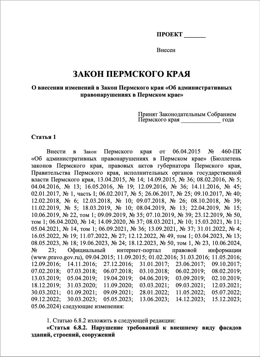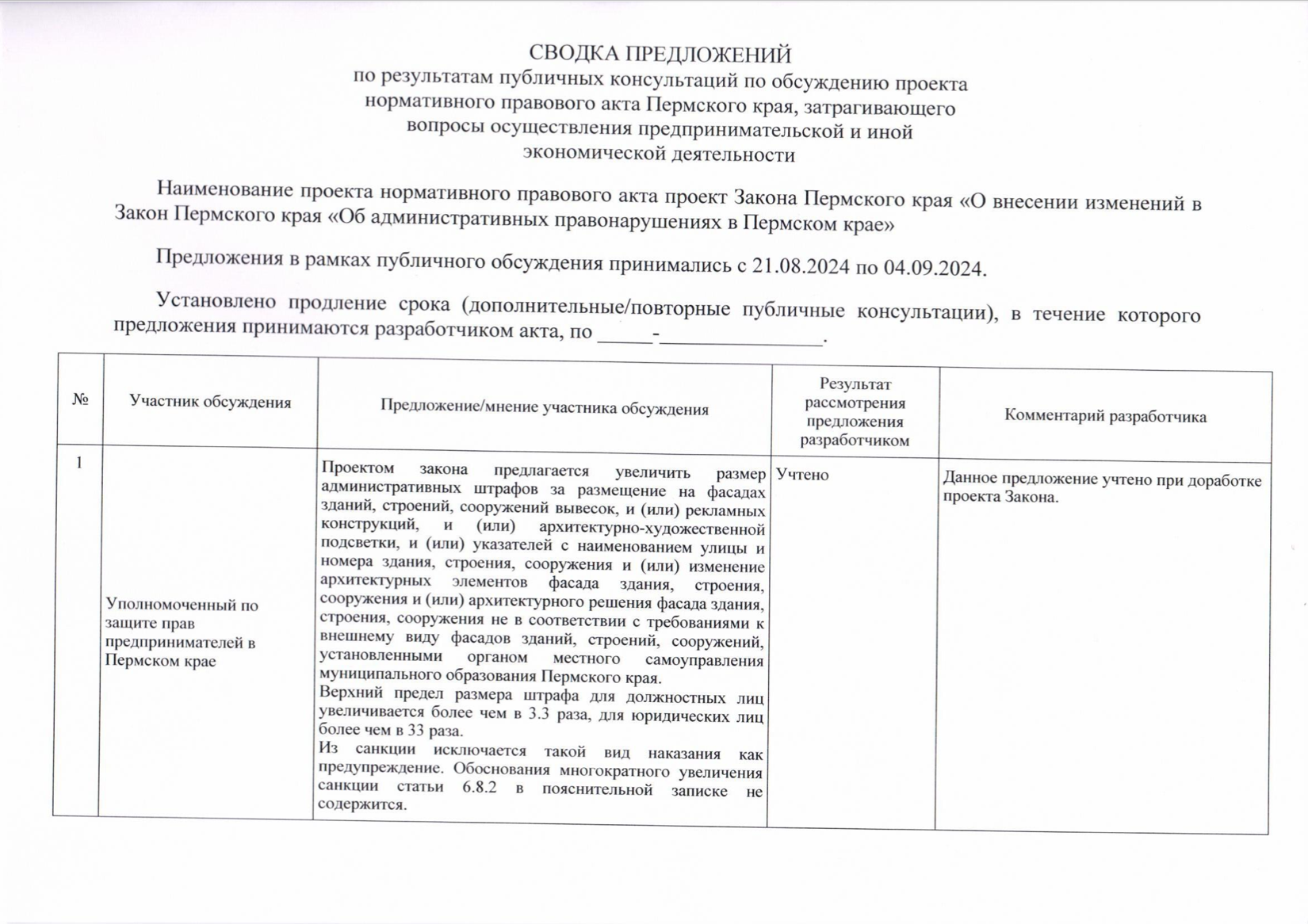 В связи с доработкой проекта Закона «О внесении изменений в Закон Пермского края от 06 апреля 2015 года № 460-ПК «Об административных правонарушениях в Пермском крае» (О стимулировании к содержанию фасадов зданий, строений, сооружений путем поддержания их в надлежащем техническом, физическом, эстетическом состоянии; стимулирование к соблюдению публичных сервитутов) и изменениями, внесенными в сводный отчет, уведомляем о начале проведения дополнительных публичных консультаций по вопросу принятия вышеуказанного Закона.