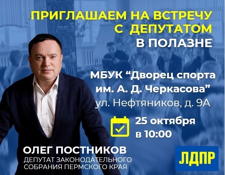 Руководитель Фракции ЛДПР в законодательном собрании Пермского края Олег Постников приедет в Полазну, чтобы пообщаться с жителями, принять от них обращения и наказы