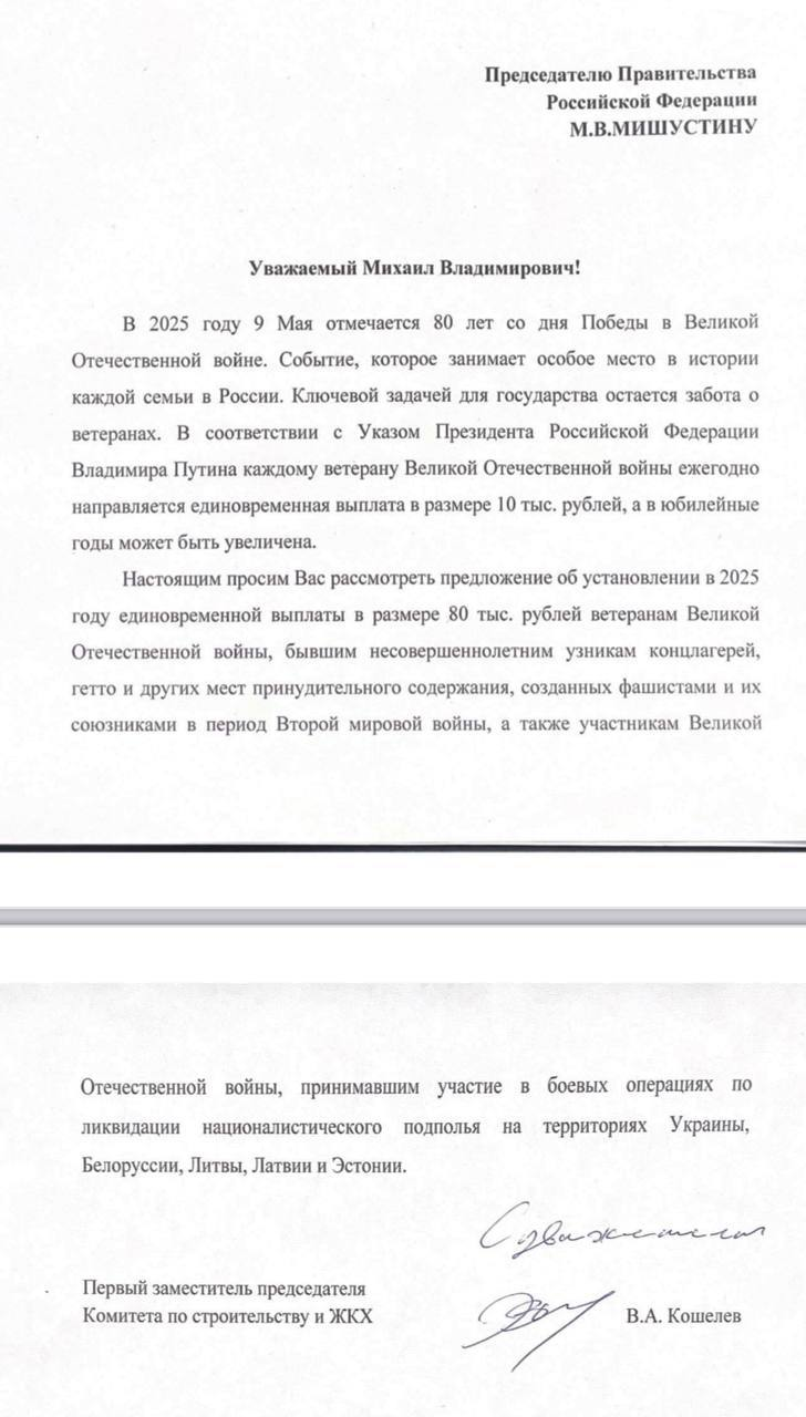 Депутат Госдумы от ЛДПР Владимир Кошелев направил запрос премьер-министру РФ Михаилу Мишустину с просьбой установить в 2025 году единовременную выплату, приуроченную к 80-летнему юбилею Победы