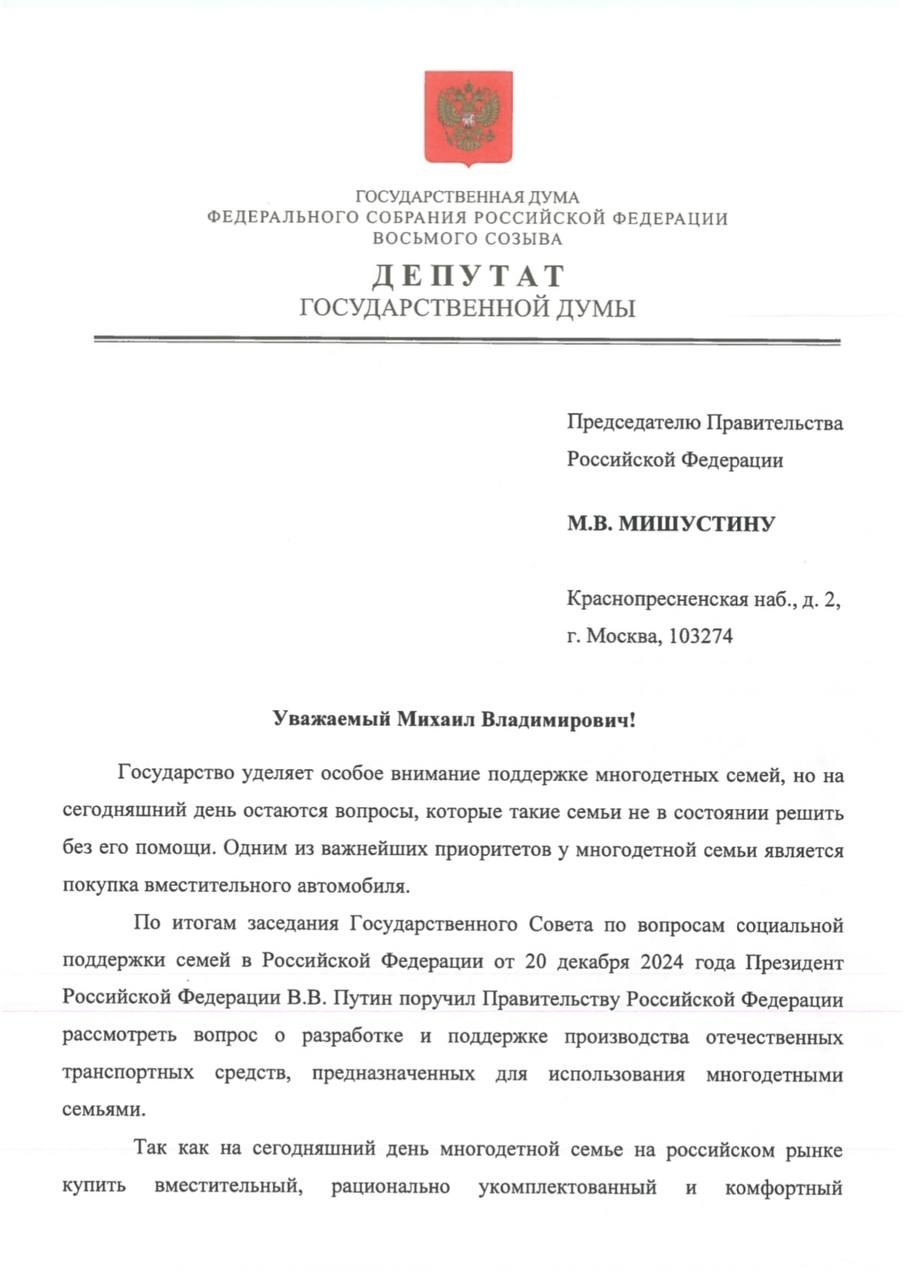 -Наши многодетные семьи заслуживают самого широкого спектра мер социальной поддержки. К сожалению, покупка авто для таких семей обходится очень дорого. Осложняет это и то, что найти надежный и вместительный минивэн на российском рынке практически невозможно, а привезти из-за рубежа — крайне дорого, - подчеркнул парламентарий.