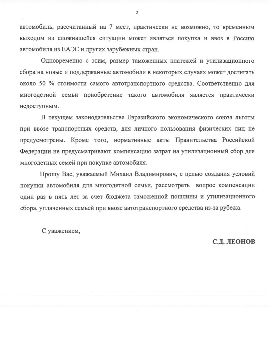-Поэтому я предлагаю Правительству рассмотреть возможность возврата многодетным семьям раз в 5 лет уплаченных таможенных пошлин и утилизационного сбора при ввозе авто из-за рубежа. Справедливым считаю компенсировать всю сумму уплаченных сборов. Только так получится добиться эффективной финансовой поддержки для наших многодетных семей в этом вопросе, - отметил Сергей Леонов.