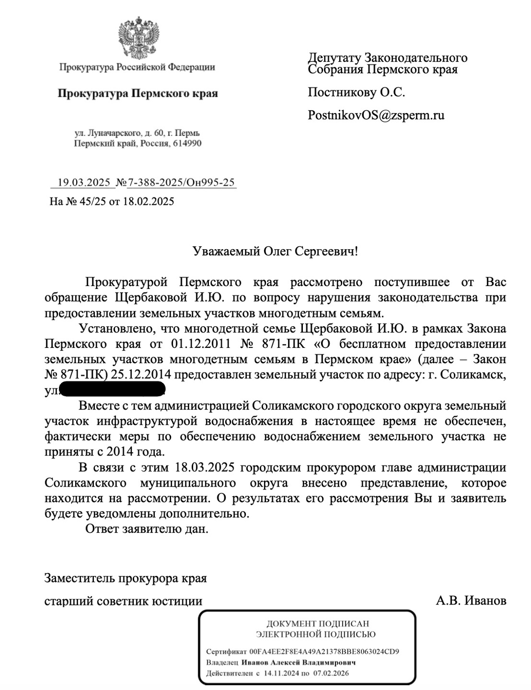 Олег Постников направил запросы в Прокуратуру и в Администрацию Соликамского городского округа с требованием организовать должную обещанную инфраструктуру для многодетных семей. После представления Прокуратуры Администрация отреагировала и включила в план инфраструктуру района.