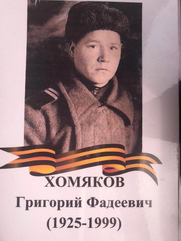 Григорий Фадеевич Хомяков — участник Великой Отечественной войны, сражался в составе 3-го Белорусского фронта. Принимал участие в освобождении городов Минск, Седлец, Познань, Кёнигсберг, Вильнюс и ряда населённых пунктов Польши. Отличился в июле 1944 года при освобождении города Вильно.