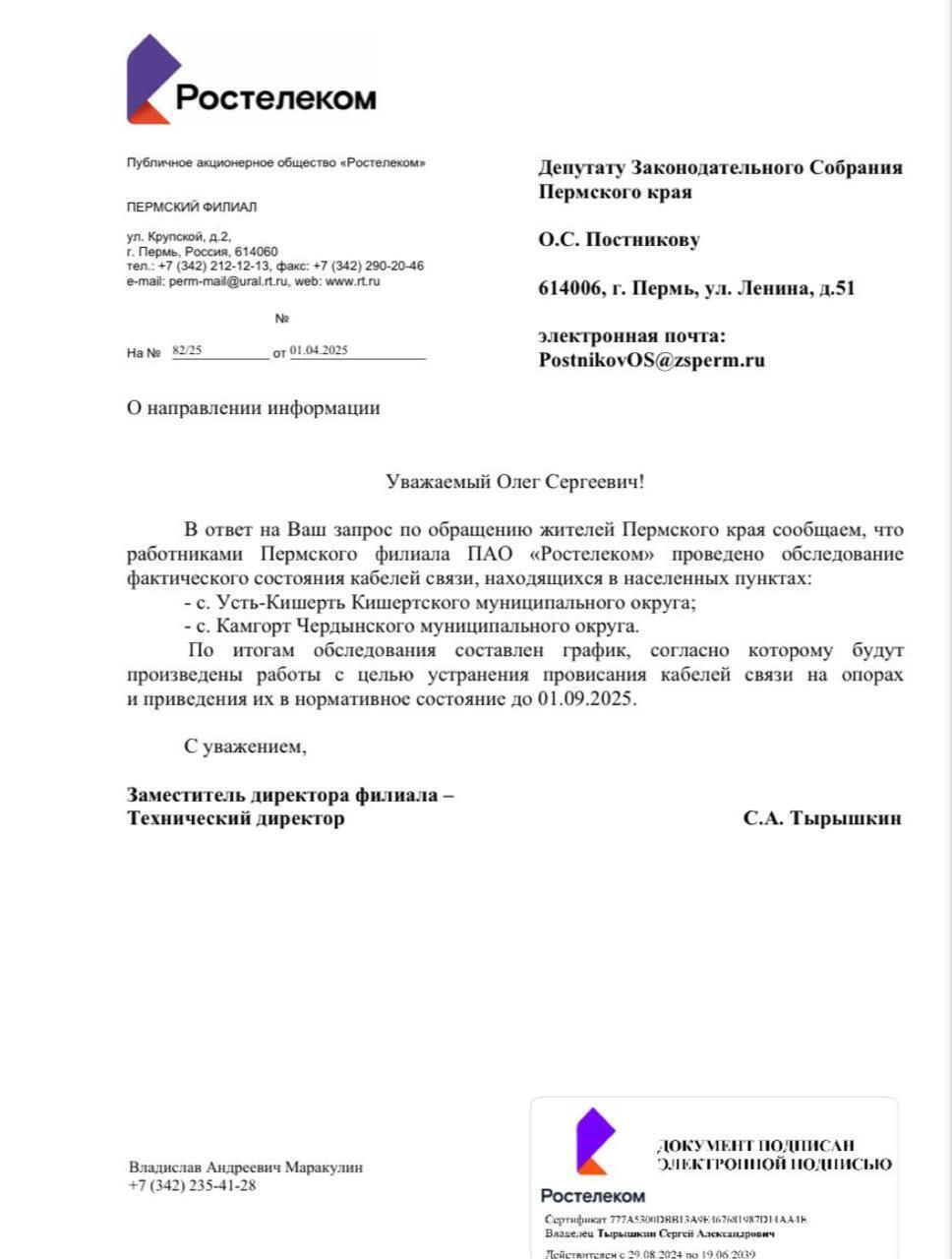В ходе приёма граждан в селе Кишерть и городе Чердынь жители сообщили о проблеме свисающих кабелей над проезжей частью и тротуарами. Особое беспокойство у людей вызвала ситуация в посёлке Камгорт, где кабель серьёзно мешал передвижению и создавал потенциальную опасность.