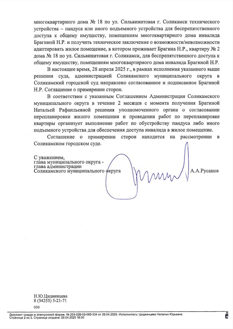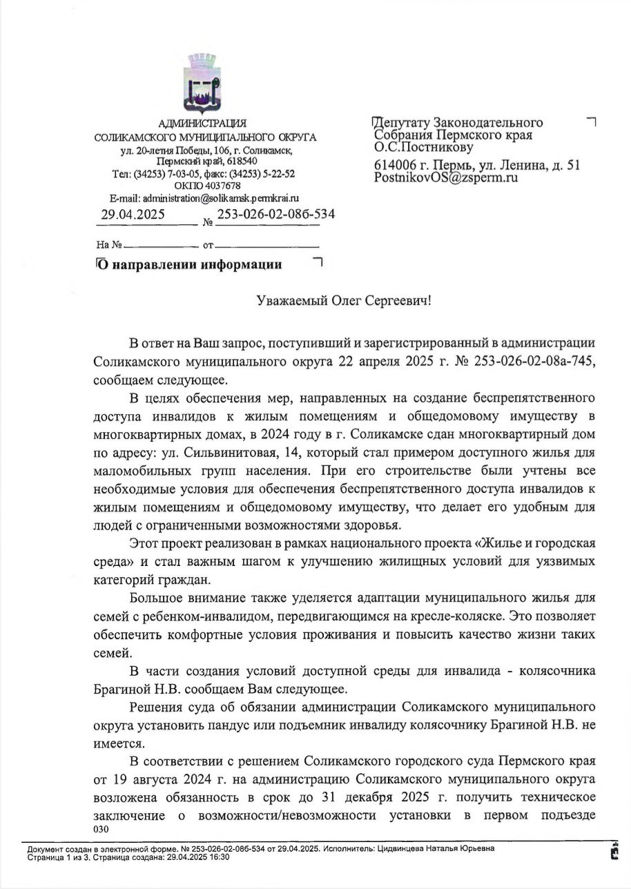 Пенсионерка-инвалид Наталья Брагина из Соликамска испытывает серьезные трудности с доступом в собственную квартиру из-за лестничных пролетов. Ситуация находится на контроле координатора Пермского регионального отделения ЛДПР Олега Постникова, ожидается подписание мирового соглашения с администрацией города по обеспечению доступа