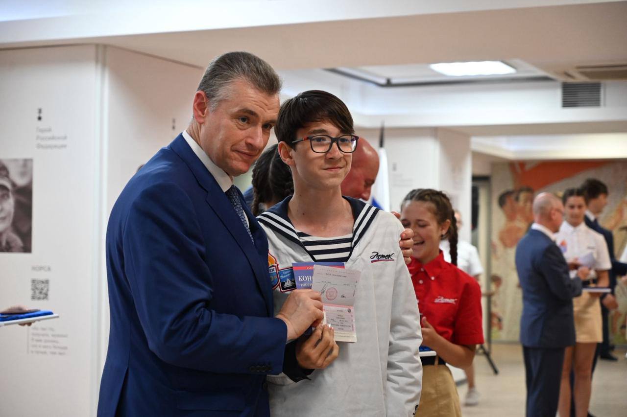 Председатель ЛДПР Леонид Слуцкий, первый замглавы администрации Президента Сергей Кириленко, вице-премьер РФ Дмитрий Чернышенко и министр просвещения Сергей Кравцов вручили в торжественной обстановке первые российские паспорта воспитанникам Международного детского центра «Артек»