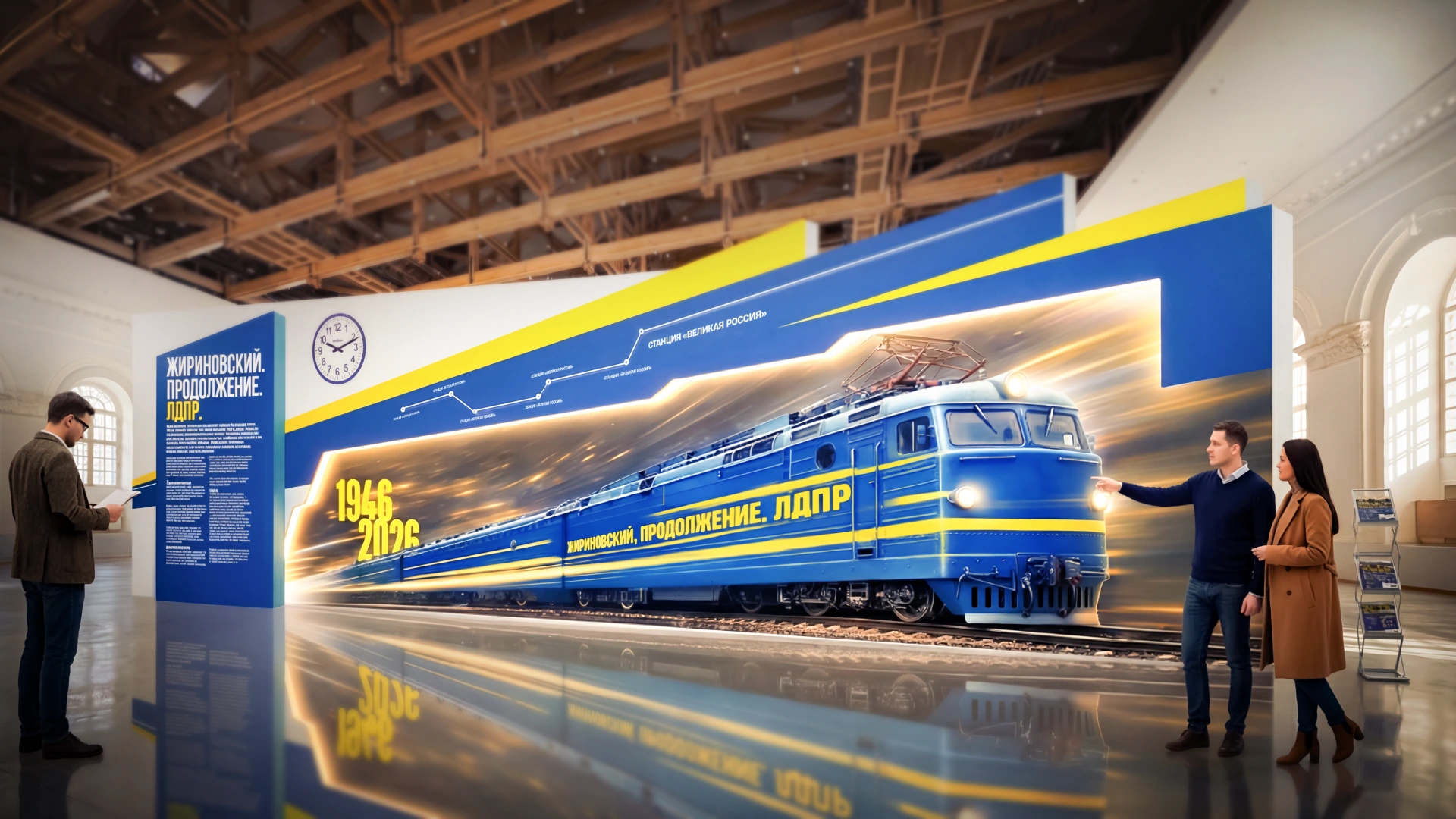Магистральным образом экспозиции станет поезд. Почему поезд? Три причины. Первая: название “Продолжение” требует движения. Вторая: агитпоезд Жириновского в 90-х — его личное ноу-хау, визитная карточка ЛДПР. Третья: каждая станция — этап жизни Владимира Вольфовича и веха истории страны».